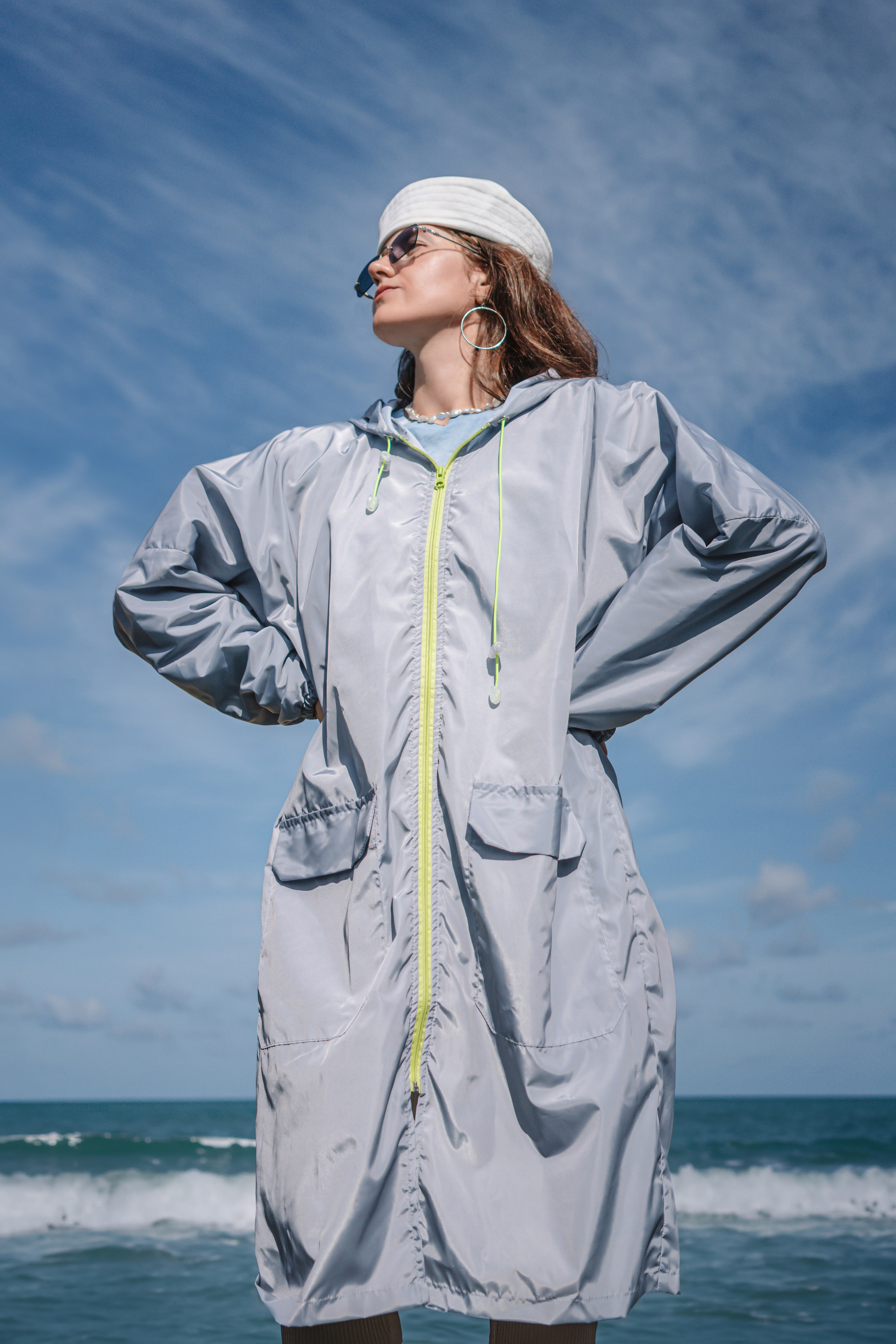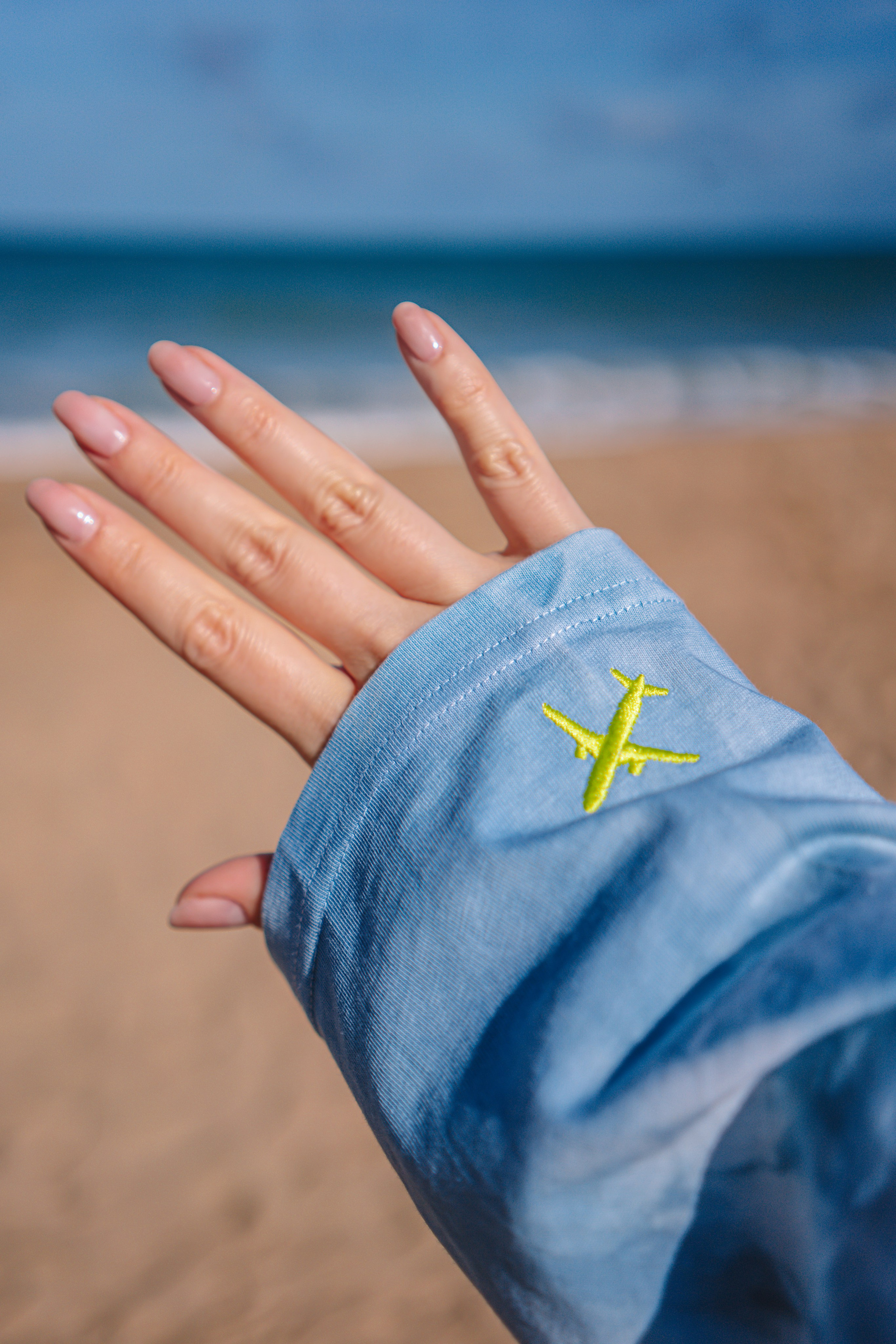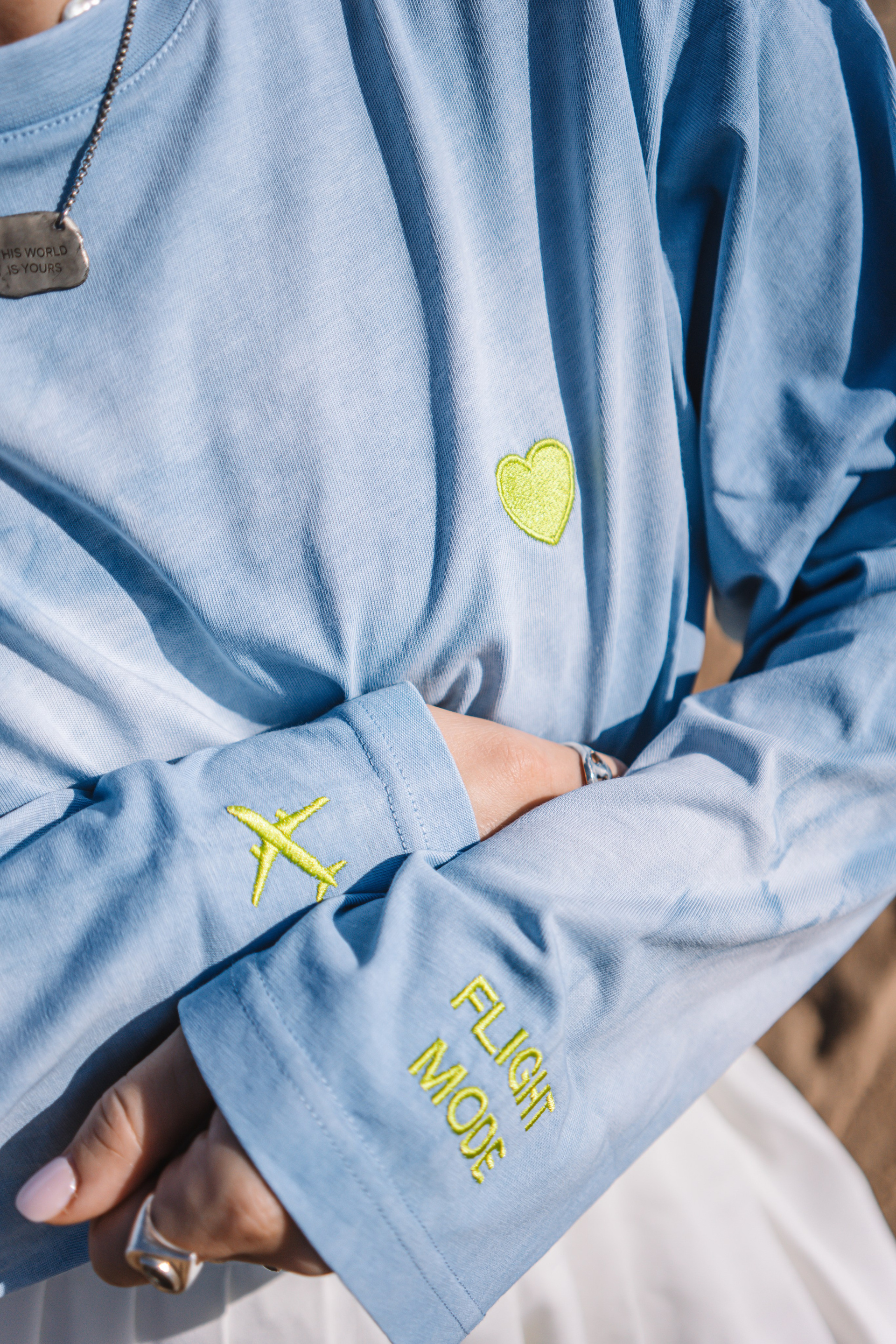 В коллекцию вошли лонгслив с вышивкой — самолетик на рукаве, вместительная сумка, высокие носки, дождевик. Так же коллекцию дополнили бусами для телефона от KrivoKoso.